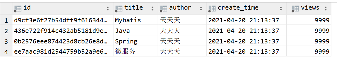 values (#{id}, #{title}, #{author}, #{createTime}, #{views});