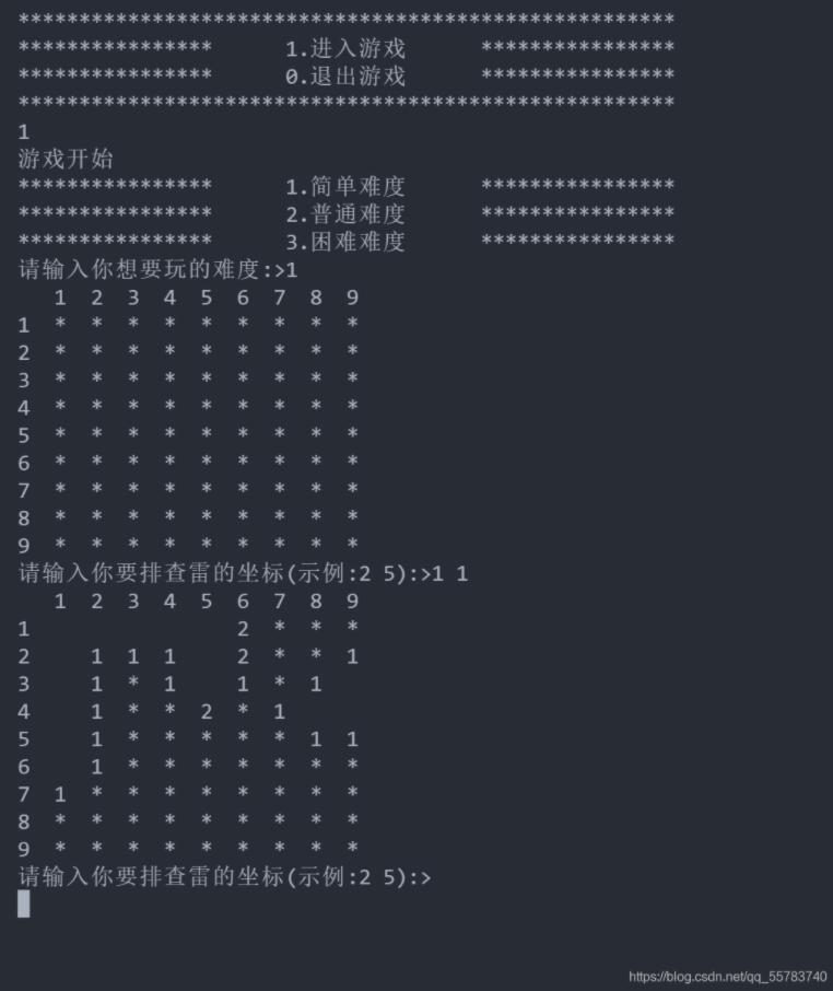 若不为0,我们通过递归去判断这个坐标周围为0的情况,把为0的情况自动去除后再打印给玩家看,去除雷的坐标用空格打印。