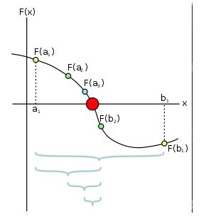 上面所示的一个迭代过程的第一次的迭代区间是 [a1​,b1​],取中点 b2​,然后第二次的迭代区间是 [a1​,b2​],再取中点 a2​,然后第三次的迭代区间是 [a2​,b2​],然后取 a3​,然后第四次的迭代区间是[a3​,b2​],再取红色中点 c,我们得到发现 f(c) 的值已经小于ϵ,输出c 作为近似解。