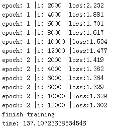 print('epoch:',epoch+1,'|i:',i+1,'|loss:%.3f'%(running_loss/2000))