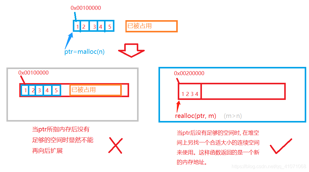 2).ptr所指内存后没有足够的空间来扩展 ,如图 :