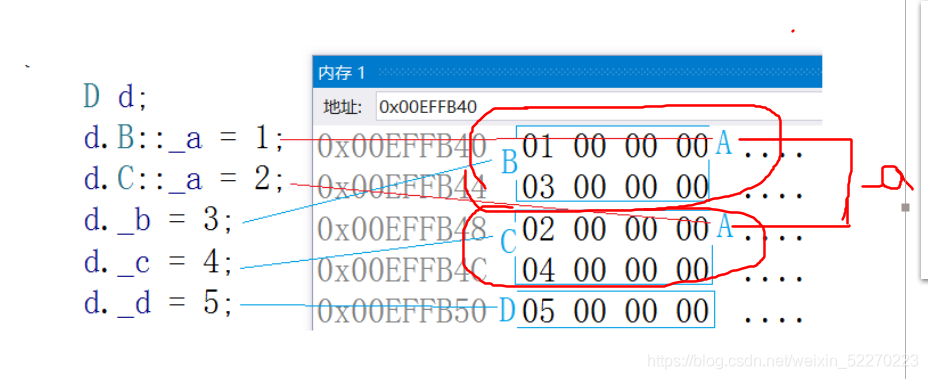 菱形虚拟继承的内存对象成员模型:这里可以分析出D对象中将A放到的了对象组成的最下面,这个A同时属于B和C,那么B和C如何去找到公共的A呢?