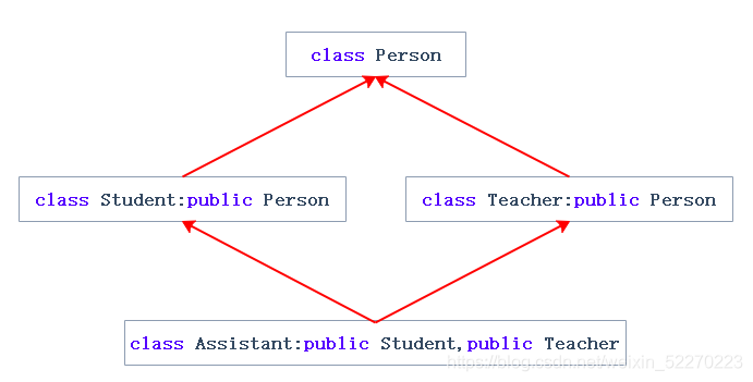 菱形继承的问题:从下面的对象成员模型构造,可以看出菱形继承有数据冗余和二义性的问题。在Assistant的对象中Person成员会有两份。