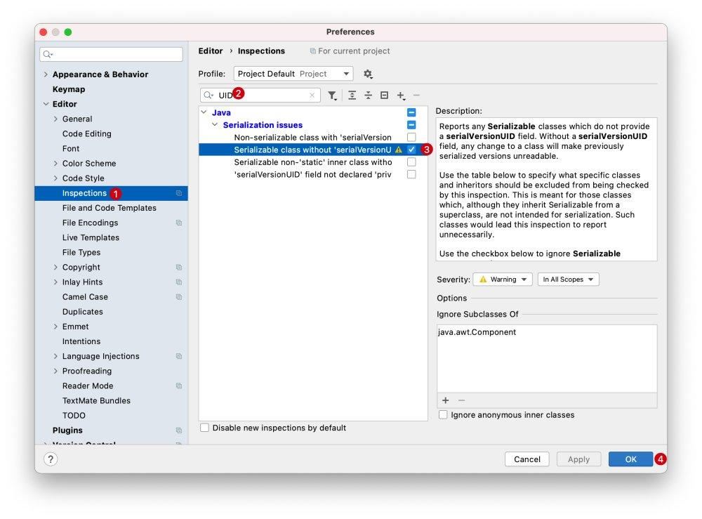 IDEA 中生成 serialVersionUID,打开设置,如下图所示勾选。