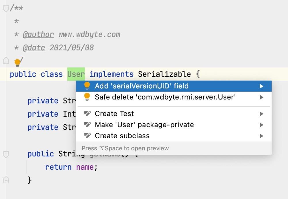 Server 端主要是构建一个可以被传输的类 User,一个可以被远程访问的类 UserService,同时这个对象要注册到 RMI 开放给客户端使用。