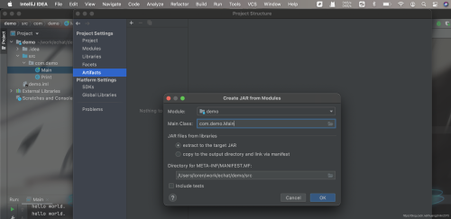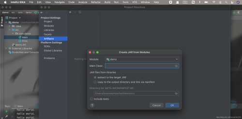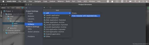 进入File->Project Structure->Project Settings->Artifacts,选中Artifacts后,点击右侧"+",选择JAR->From modules with dependencies