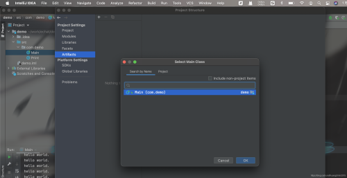 在Main Class输入框输入Main类的全路径名,本项目中为com.demo.Main。也可以点击右侧文件图标,弹出选择Main class的弹窗: