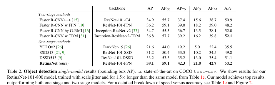 接下来看下实验结果,为了验证Focal Loss,作者提出了一种新的one-stage detector架构RetinaNet,采用的是resnet_fpn,同时scales增加到15个,如Figure 3所示