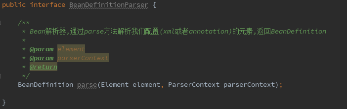 比如这个配置Bean,spring也会将className、scope、lazy等这些属性装配到PersonAction对应的BeanDefintaion中.具体采用的是BeanDefinitionParser接口中的parse(Element element, ParserContext parserContext)方法,该接口有很多不同的实现类。通过实现类去解析注解或者xml然后放到BeanDefination中,BeanDefintaion的作用是集成了我们的配置对象中的各种属性,重要的有这个bean的ClassName,还有是否是Singleton、对象的属性和值等(如果是单例的话,后面会将这个单例对象放入到spring的单例池中)。spring后期如果需要这些属性就会直接从它中获取。然后,再注册到一个ConcurrentHashMap中,在spring中具体的方法就是registerBeanDefinition(),这个Map存的key是对象的名字,比如Person这个对象,它的名字就是person,值是BeanDefination,它位于DefaultListableBeanFactory类下面的beanDefinitionMap类属性中,同时将所有的bean的名字放入到beanDefinitionNames这个list中,目的就是方便取beanName;