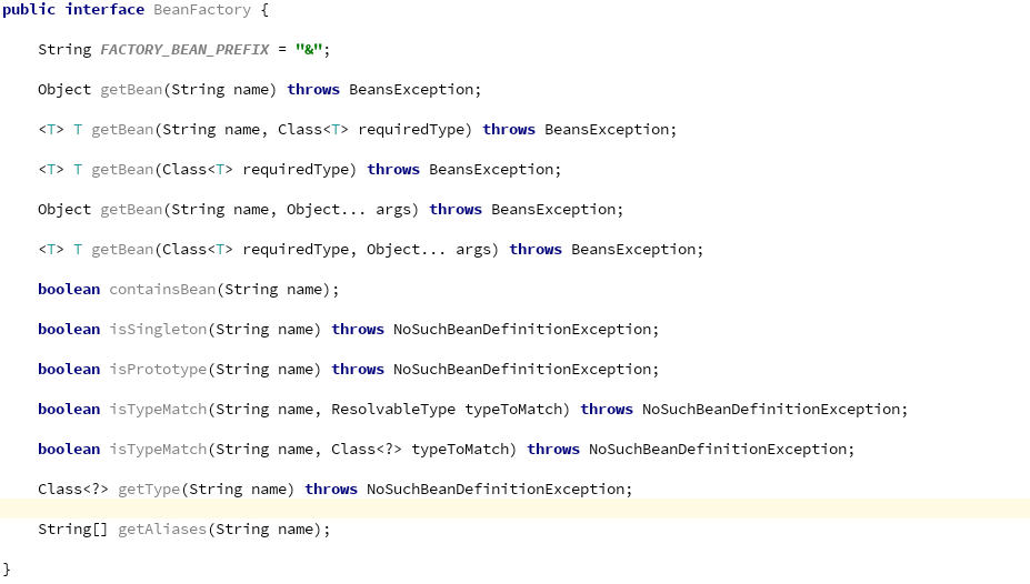BeanFactory是个bean 工厂类接口,是负责生产和管理bean的工厂,是IOC容器最底层和基础的接口,spring用它来管理和装配普通bean的IOC容器,它有多种实现,比如AnnotationConfigApplicationContext、XmlWebApplicationContext等。