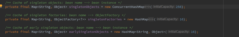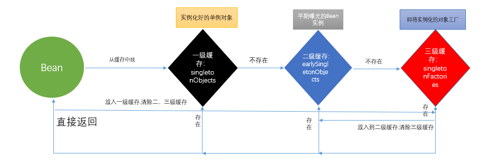 如何解决这个问题呢?spring解决这个问题主要靠巧妙的三层缓存,所谓的缓存主要是指这三个map,singletonObjects主要存放的是单例对象,属于第一级缓存;singletonFactories属于单例工厂对象,属于第三级缓存;earlySingletonObjects属于第二级缓存,如何理解early这个标识呢?它表示只是经过了实例化尚未初始化的对象。Spring首先从singletonObjects(一级缓存)中尝试获取,如果获取不到并且对象在创建中,则尝试从earlySingletonObjects(二级缓存)中获取,如果还是获取不到并且允许从singletonFactories通过getObject获取,则通过singletonFactory.getObject()(三级缓存)获取。如果获取到了则移除对应的singletonFactory,将singletonObject放入到earlySingletonObjects,其实就是将三级缓存提升到二级缓存,这个就是缓存升级。spring在进行对象创建的时候,会依次从一级、二级、三级缓存中寻找对象,如果找到直接返回。由于是初次创建,只能从第三级缓存中找到(实例化阶段放入进去的),创建完实例,然后将缓存放到第一级缓存中。下次循环依赖的再直接从一级缓存中就可以拿到实例对象了。