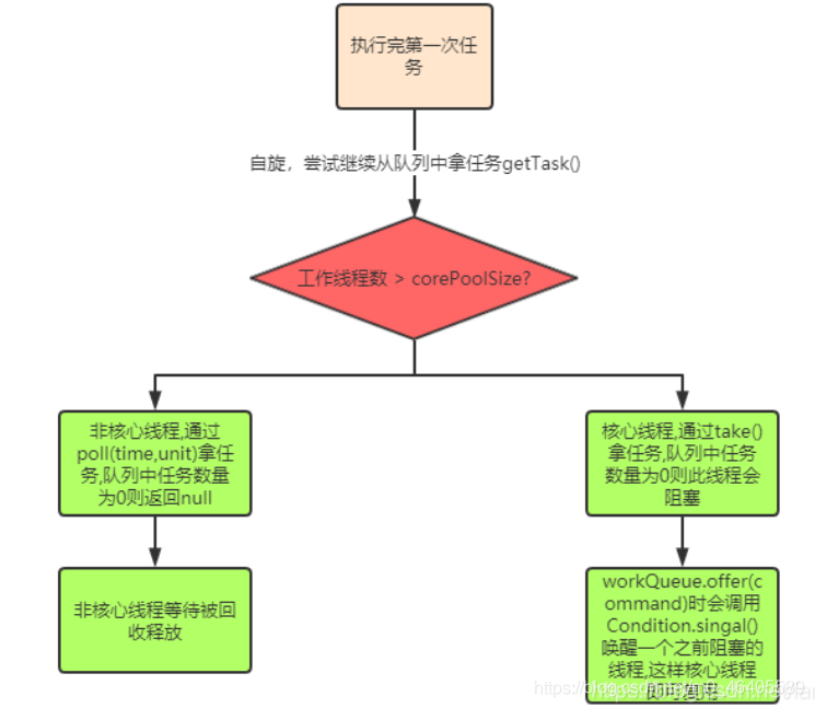 3.take()方式取任务,如果队列中没有任务了会调用await()阻塞当前线程,直到新任务到来,所以核心工作线程不会被回收; 当执行execute方法里的workQueue.offer(command)时会调用Condition.singal()方法唤醒一个之前阻塞的线程,这样核心线程即可复用