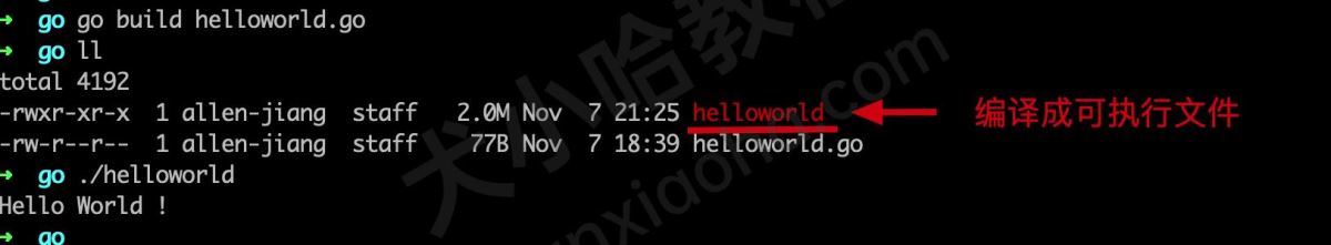 还可以通过执行 go build 命令,将刚刚这段代码编译成可执行文件: