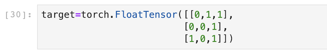 import torch import torch.nn a = torch.Tensor([[1,2,3]]) nll = nn.NLLLoss() target1 = torch.Tensor([0]).long() target2 = torch.Tensor([1]).long() target3 = torch.Tensor([2]).long() #测试 n1 = nll(a,target1) #输出:tensor(-1.) n2 = nll(a,target2) #输出:tensor(-2.) n3 = nll(a,target3) #输出:tensor(-3.)