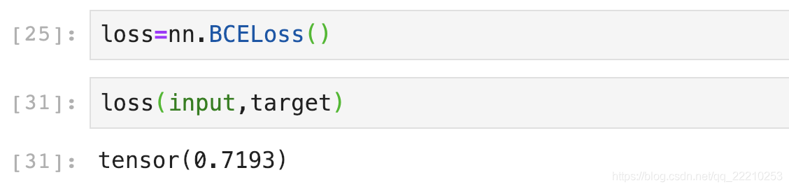 BCEWithLogitsLoss就是把Sigmoid-BCELoss合成一步。我们直接用刚刚的input验证一下是不是0.7193:
