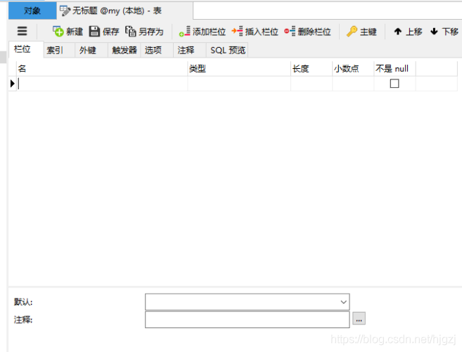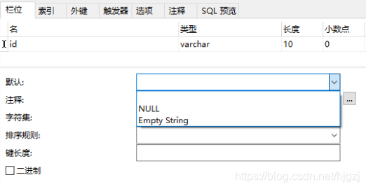 varchar:默认中有三个选项,当插入数据时不插入该字段时,数据库会根据这项自动插入数据:选择第一个时可以编辑这个输入框,插入自定义的数据;选择第二个时会插入null(非字符串null,就是表示什么都没);选择第三个时会插入空字符串。其他的选项一般不用管,保存表时会字段填入默认值。