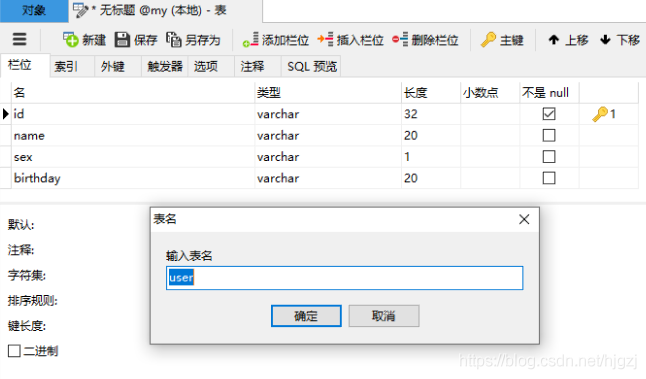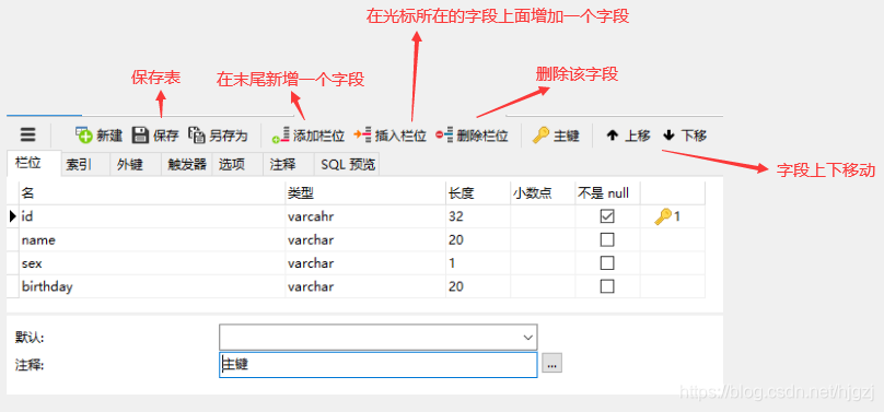 不管是什么字段类型,下面都会有注释输入框,就是填入该字段代表的意义,这个虽然可以不填,但是要养成一个良好的习惯就必须填。这里我要说一下,一个字段要选择什么样的类型没什么规定,主要看工作中公司怎么要求的,例如A公司要求年龄用int,性别用char,时间用datetime,B公司要求所有字段都用varchar。我在接下来的教程里会把字段类型全部设置成varchar,这点不用纠结为啥了。