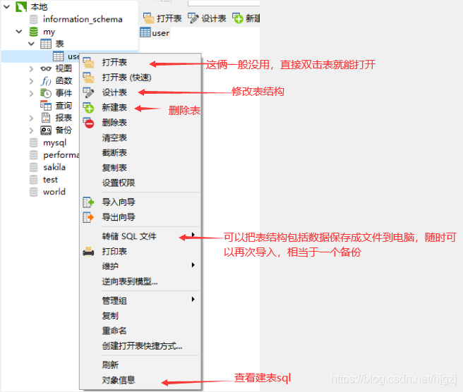 以上菜单里的选项建议都用一下,试试功能,下一节讲表的增删改查。