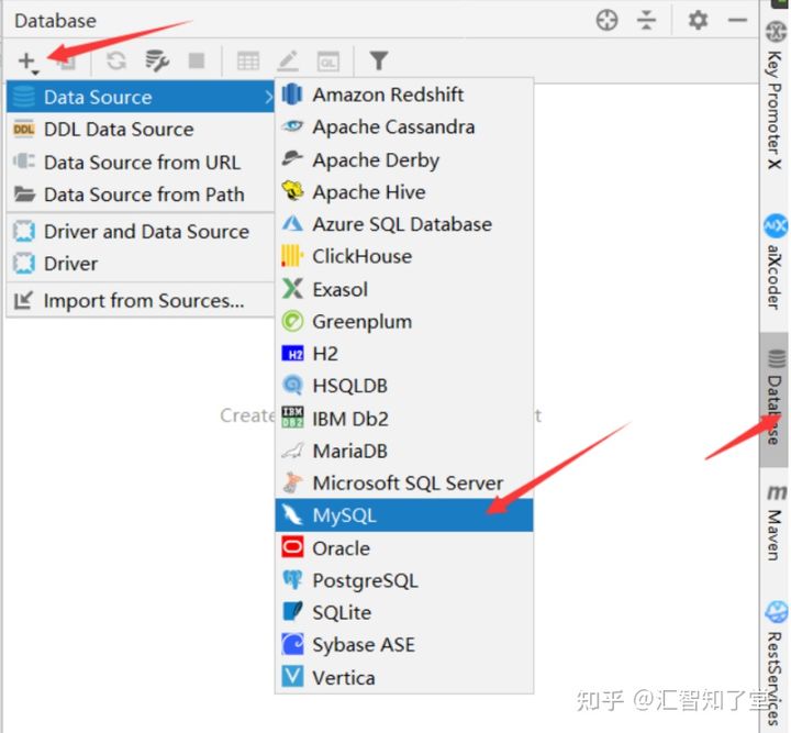 点击IDEA右侧的Datbase->点击上方的加号->选择Data Source.->Mysql