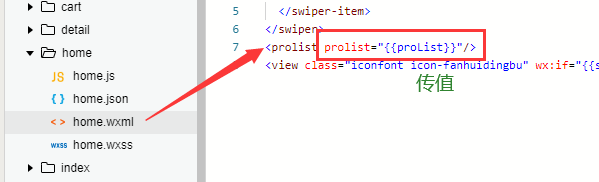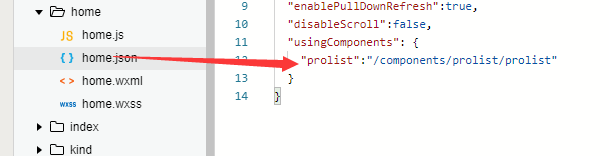 4、在自定义组件(prolist)里完成逻辑代码 5、在要引用组件的页面中的json文件中,注册组件