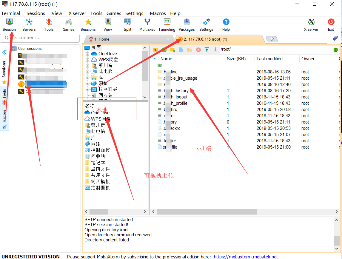 文件拖拽上传打开 Mobaxterm 工具的控制台,点击 sftp 栏,切换到控制台的图形化界面。Mobaxterm 支持文件从本地到控制台的拖拽上传。点击上传