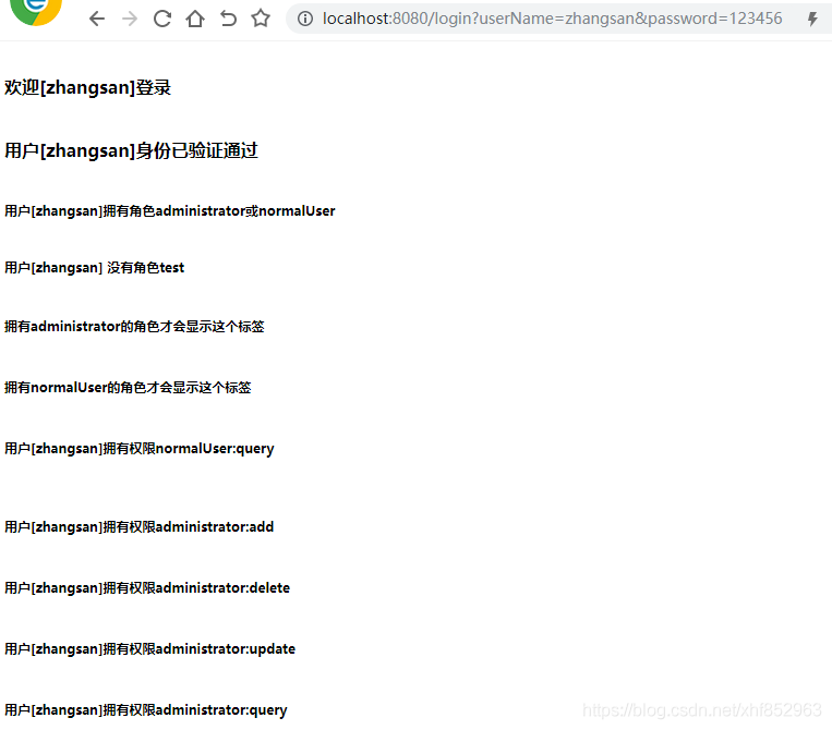 在浏览器输入:http://localhost:8080/login?userName=zhangsan&password=123456 展示内容如下所示: