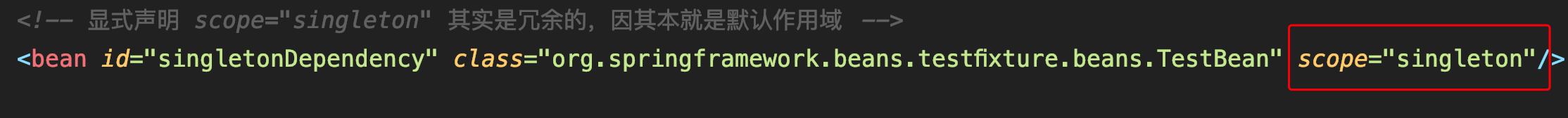单例作用域是Spring的默认作用域,下面的例子是在基于XML的配置中配置单例模式的Bean。
