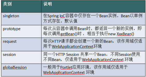 Spring Framework支持五种作用域,分别阐述如下表。
