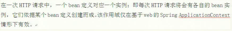 | 请求(request) | 一个HTTP请求会产生一个Bean对象,也就是说,每一个HTTP请求都有自己的Bean实例。只在基于web的Spring ApplicationContext中可用 |
