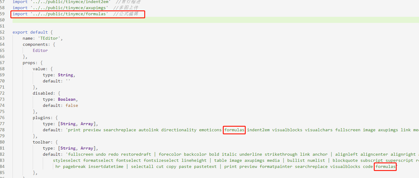 在src/components/TEditor.vue里的引入公式编辑插件,并在plugins和toolbar里注册该插件 import '../../public/tinymce/formulas' //公式编辑