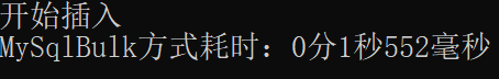 Console.WriteLine("MySqlBulk方式耗时:" + spanTime.Minutes + "分" + spanTime.Seconds + "秒" + spanTime.Milliseconds + "毫秒");