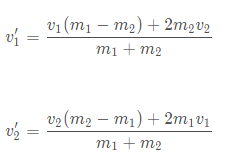 let v1nn = ball1.cor * ((ball1.mass - ball2.mass) * v1n + 2 *ball2.mass *v2n ) / (ball1.mass +ball2.mass) // 碰撞后公式