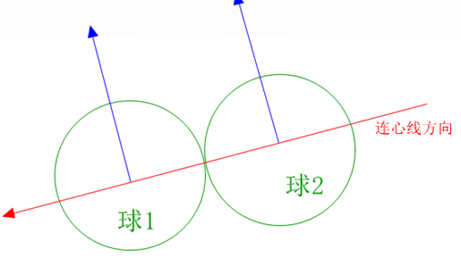 - 而连心线上是相互碰撞的(如下图所示),会有作用力,所以我们只需要求出球1和球2的连心线方向上的速度值.