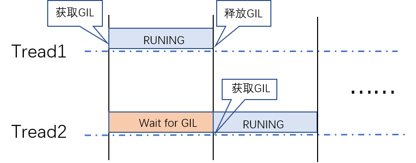 某个线程想要执行,必须先拿到 GIL,并且在一个 Python 进程中,GIL 只有一个,导致即使在多核的条件下,同一时刻也只能执行一个线程。每一个线程执行完一段后,会释放 GIL,以允许别的线程开始利用资源。