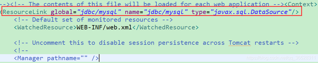 第二步,找到Tomcat的context.xml,在Context节点下加一个ResourceLink节点对第一步配置的数据源进行引用