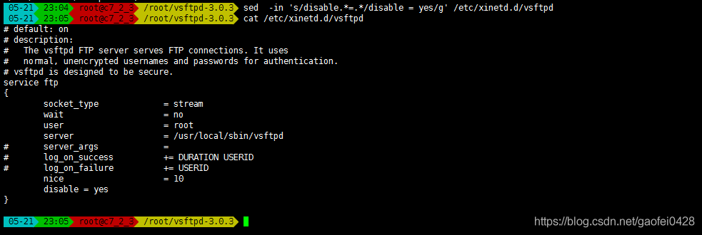 • sed -in 's/disable.*=.*/disable = yes/g' /etc/xinetd.d/vsftpd