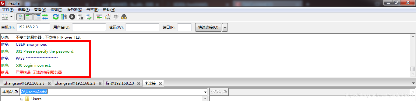 • 匿名用户形式:默认安装的情况下,系统只提供匿名用户访问,只需要输入用户anonymous/ftp,并将自己的Email作为口令即可登录。