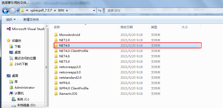 这里可以通过Nuget下载该文件。或者在手动下载引用,dll文件在下载后的文件包BIN文件夹下,如本次测试使用的是.NET4.0下面的dll,即spire.pdf_7.5.7\BIN\NET4.0\Spire.Pdf.dll,如图: