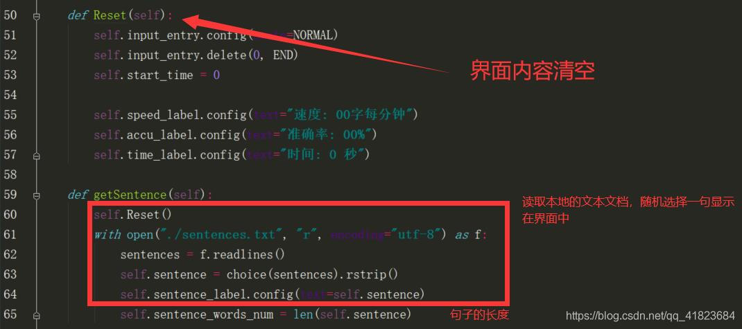 而对比文本的显示,则是通过调用self.getSentence函数来实现,程序读取本地的sentences.txt文本后,读取所有的文本内容,其中每一行都是一个独立的句子。
