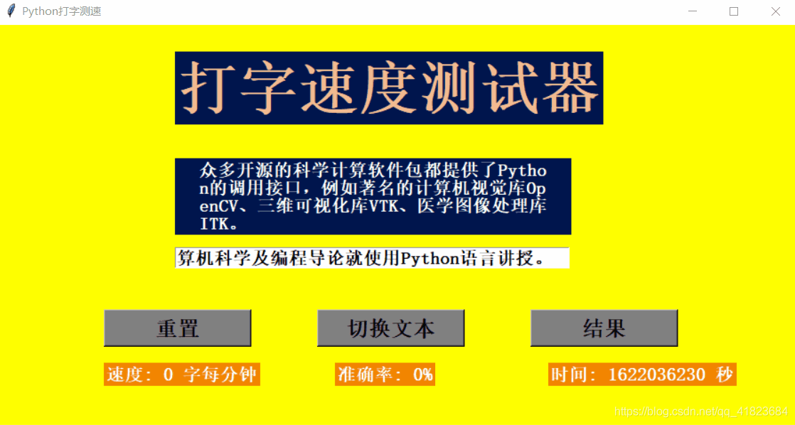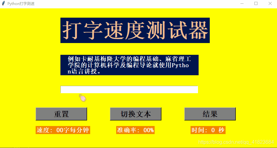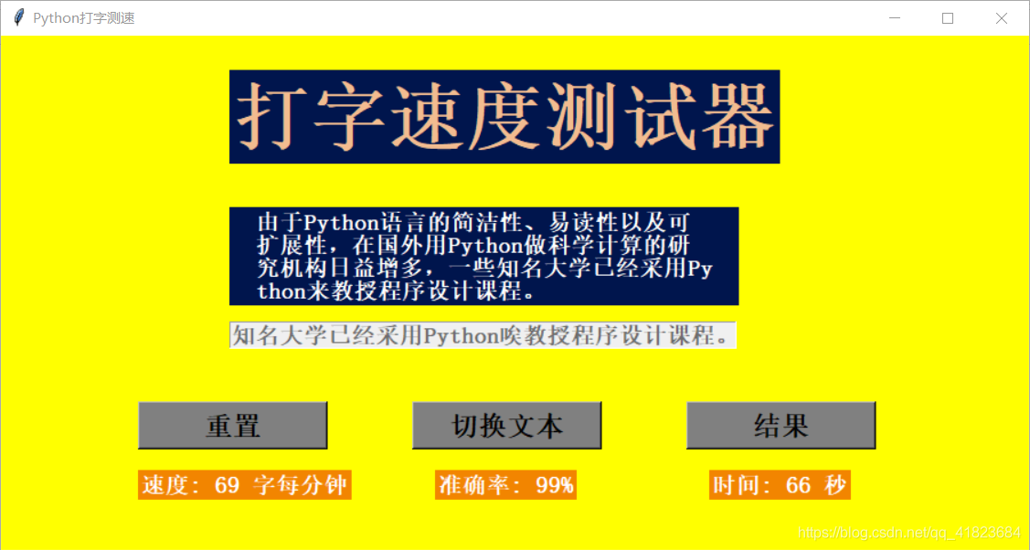 当我们输入文本的长度和展示的文本长度一致时,程序会自动调用self.result函数,来进行结果的计算和显示。其效果如下图所示。