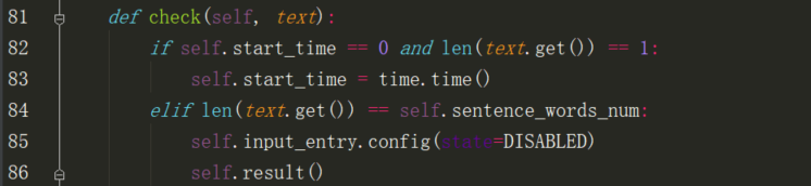 当我们输入文本时,通过StringVar对象的trace函数来实时跟踪文本,并执行self.check函数,self.check函数的作用是当开始输入文本时,设置self.start_time为文本输入的时间。