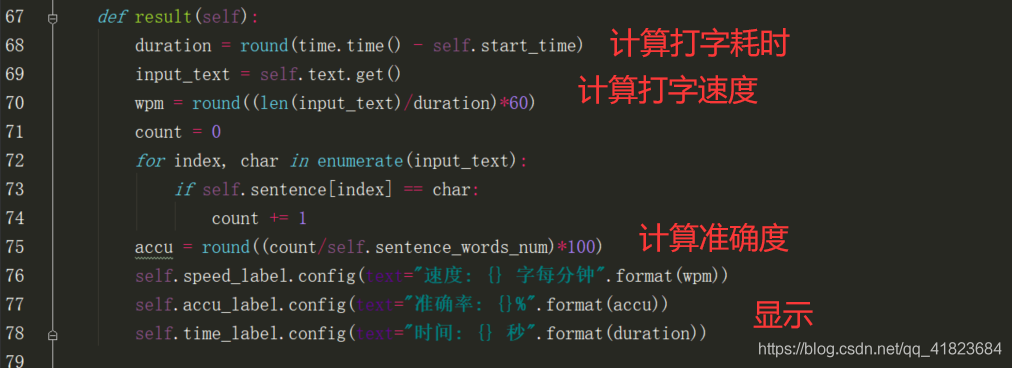 对于打字速度的计算和显示,则是通过调用self.result函数来实现的,其程序如下图所示: