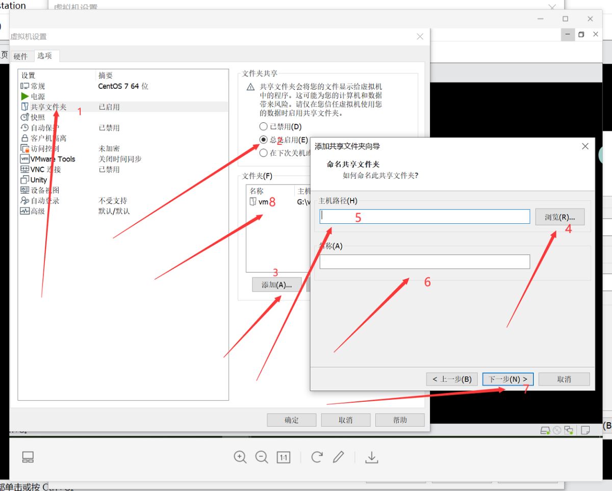 3、在文件夹 :添加共享目录;弹出窗口点击下一步--》设置共享文件夹目录 地址、共享文件夹名称 ---》启用此共享 --》完成。 虚拟机设置完成。
