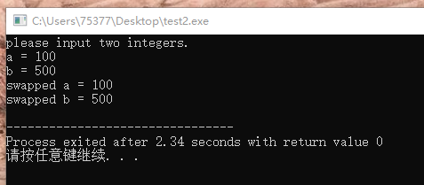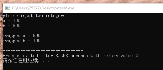 swap2(&a, &b); //将a和b的指针作为实参传递给指针变量n1和n2,n1和n2称为指向a和b的指针,*n1和*n2分别为a和b的别名,对*n1和n2进行修改,就相当于对a和b进行修改