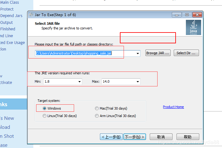 第四步:选择你要输出的jar文件全路径以及所使用的平台,运行时JRE的版本,建议选此软件支持的最低版本和最高版本即可。
