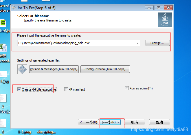 第九步:选择最终生成的.exe文件的名字和存储位置,一定要勾选create 64 bit executive,否则等下双击exe文件报错:Java Runtime Enviroment bit valid