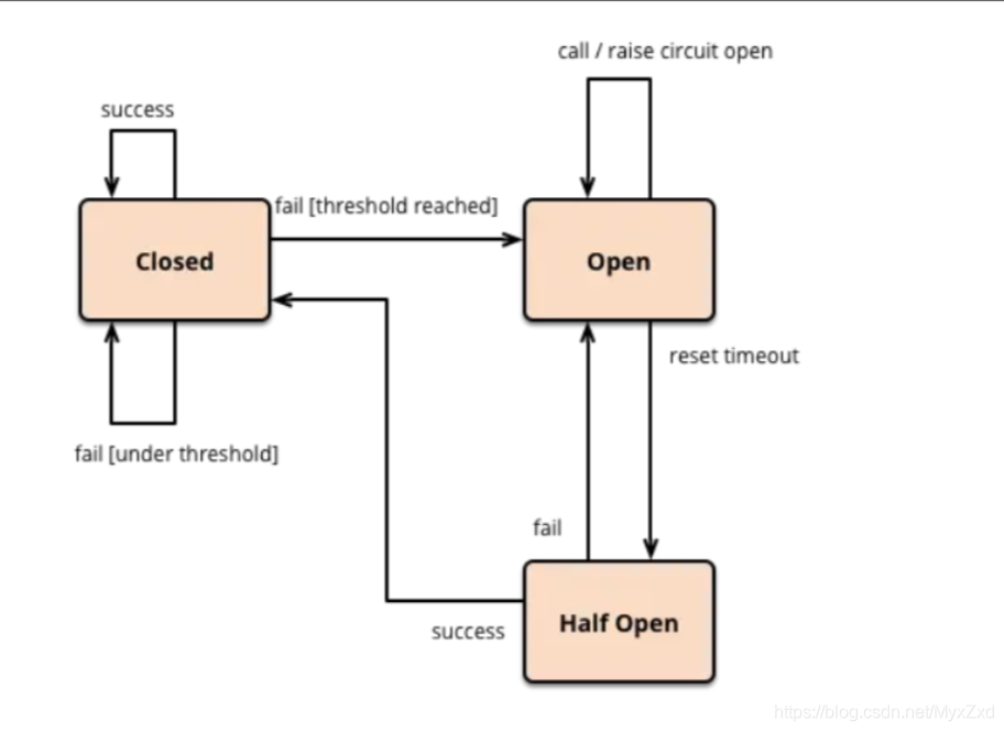 3: 错误百分比阈值:当请求总数在快照时间窗口内超过了阈值,比如发生了30次调用,如果在这30次调用中,有15次发生了超时异常,也就是超过50%的错误百分比,在默认设定50%阈值情况下,这时候就会将断路器打开。