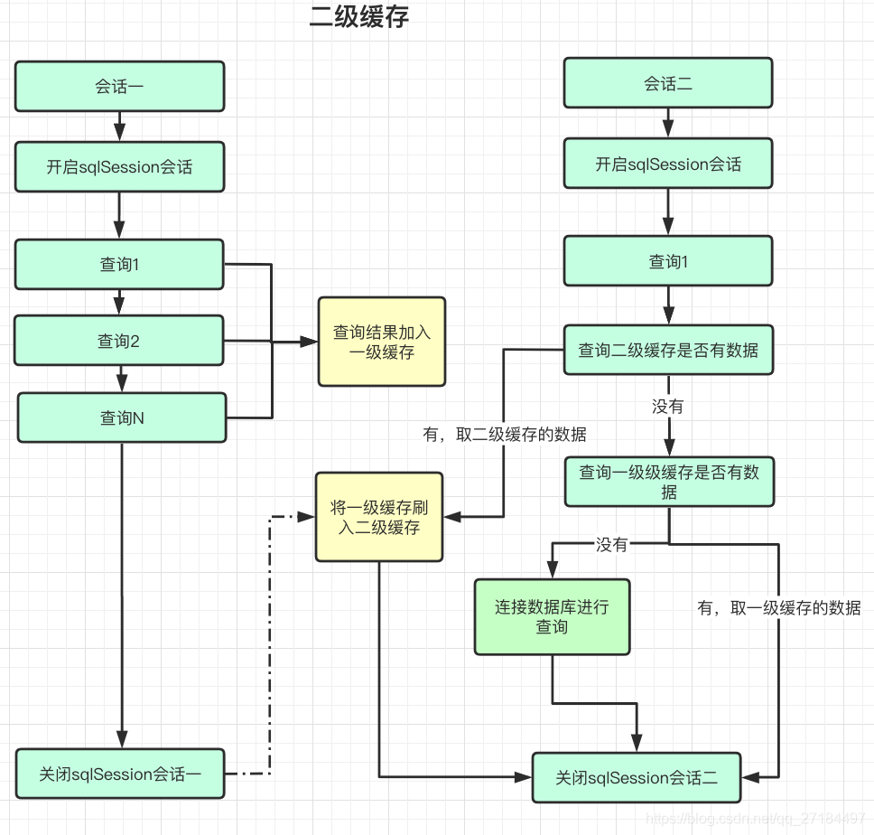 缓存会先放在一级缓存中,当sqlSession会话提交或者关闭时才会将一级缓存刷新到二级缓存中;开启二级缓存后,用户查询时,会先去二级缓存中找,找不到在去一级缓存中找;