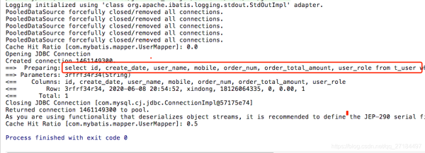结果可以看到,代码中执行了2次查询, 但实际运行时只查询了一次数据库,第二次获取数据时直接从缓存中读取,并且2次读取的数据都是一样的,到这里,一级缓存就已经生效了;