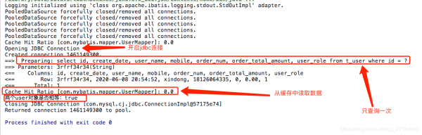 打印结果很明显,2次查询,但是日志显示只查询了一次数据库, 第二次是从缓存中获取的数据,至此,二级缓存已开启!